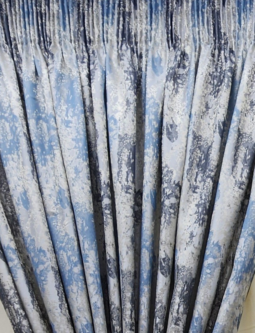 Add a touch of contemporary elegance to your home with these refined, high-quality curtains. The fabric features a striking abstract design with vertical “stripes” of lighter blue, darker blueish grey that add depth and texture to your windows. This versatile look is a perfect choice for holiday homes or any living area where you want to achieve a calm yet stylish atmosphere.